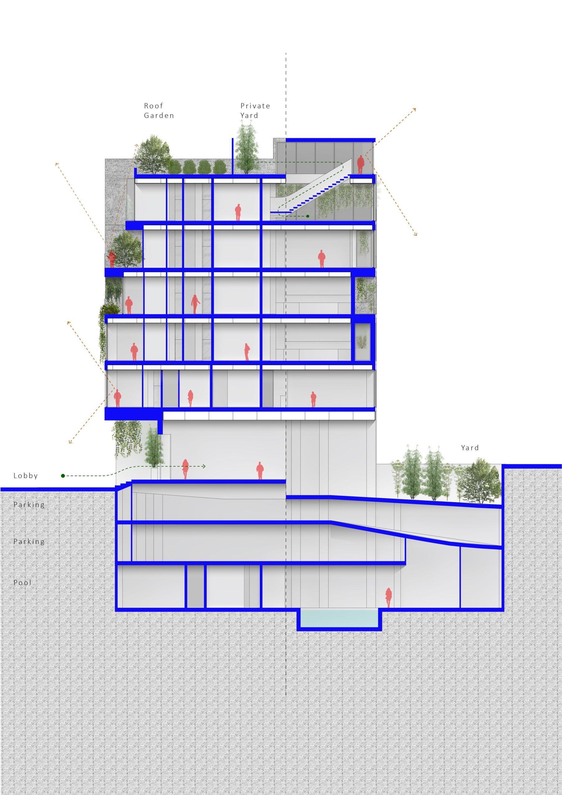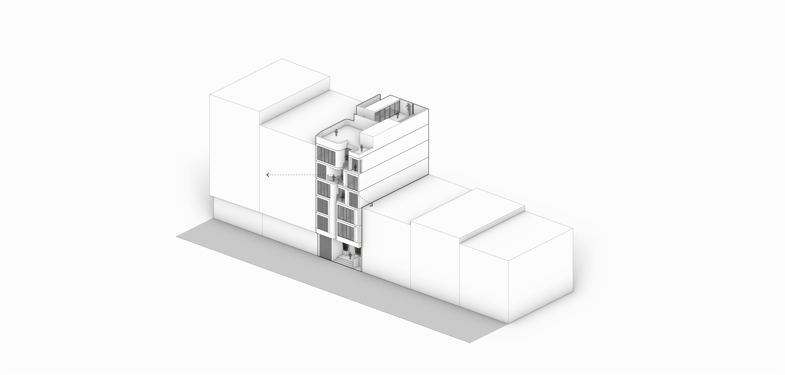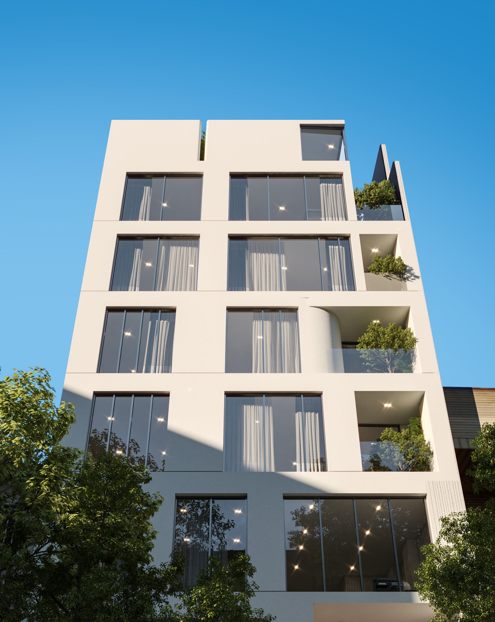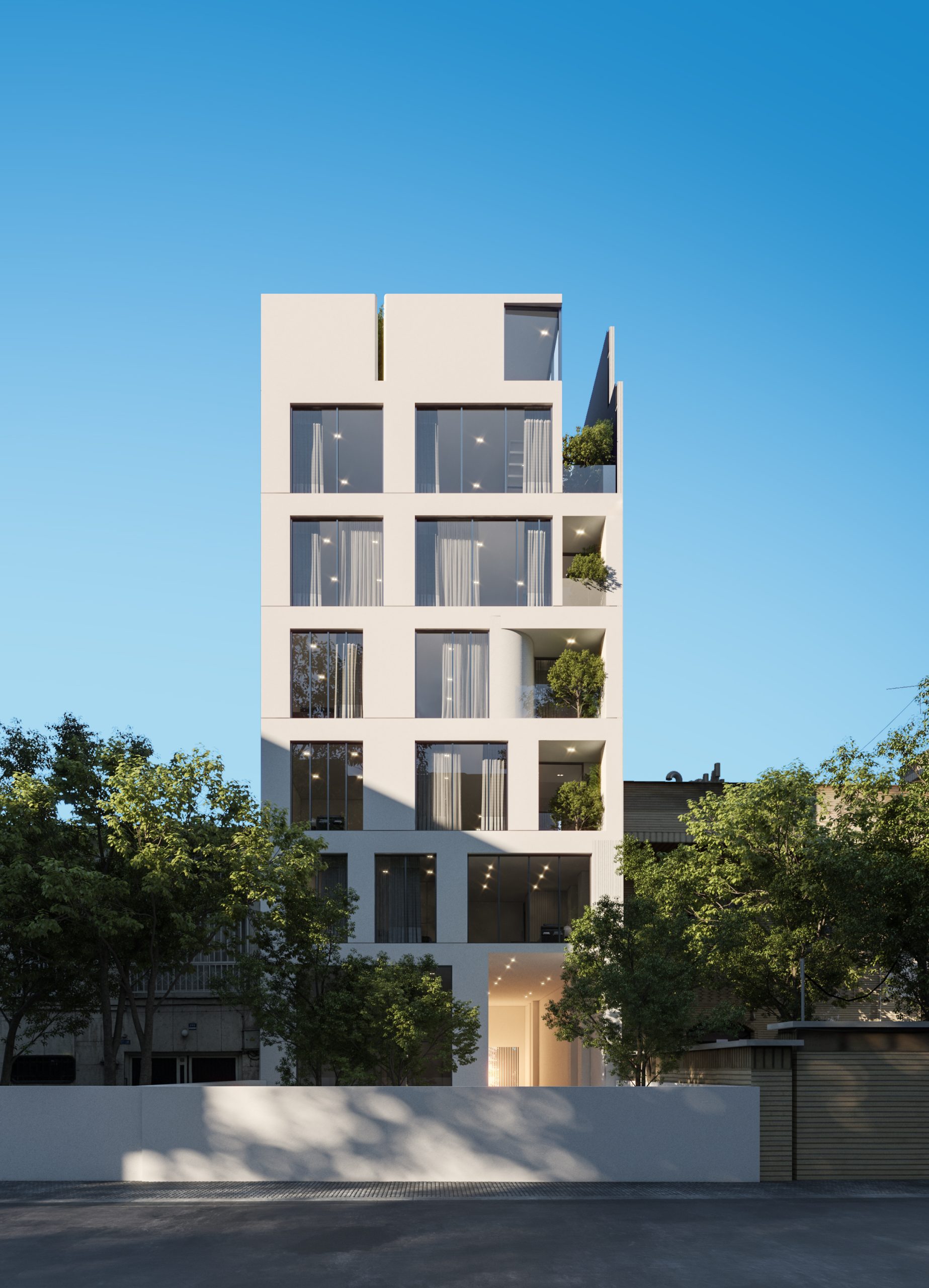The interplay between mass and void, echoed in different rhythms throughout the floors, lends the facade a dynamic and attractive appearance. The inclusion of terraces adds depth to the facade’s structure, while curved edges and vegetation create a sense of softness and tranquility, contrasting with the facade’s angular elements, reinforcing the concept of residence.