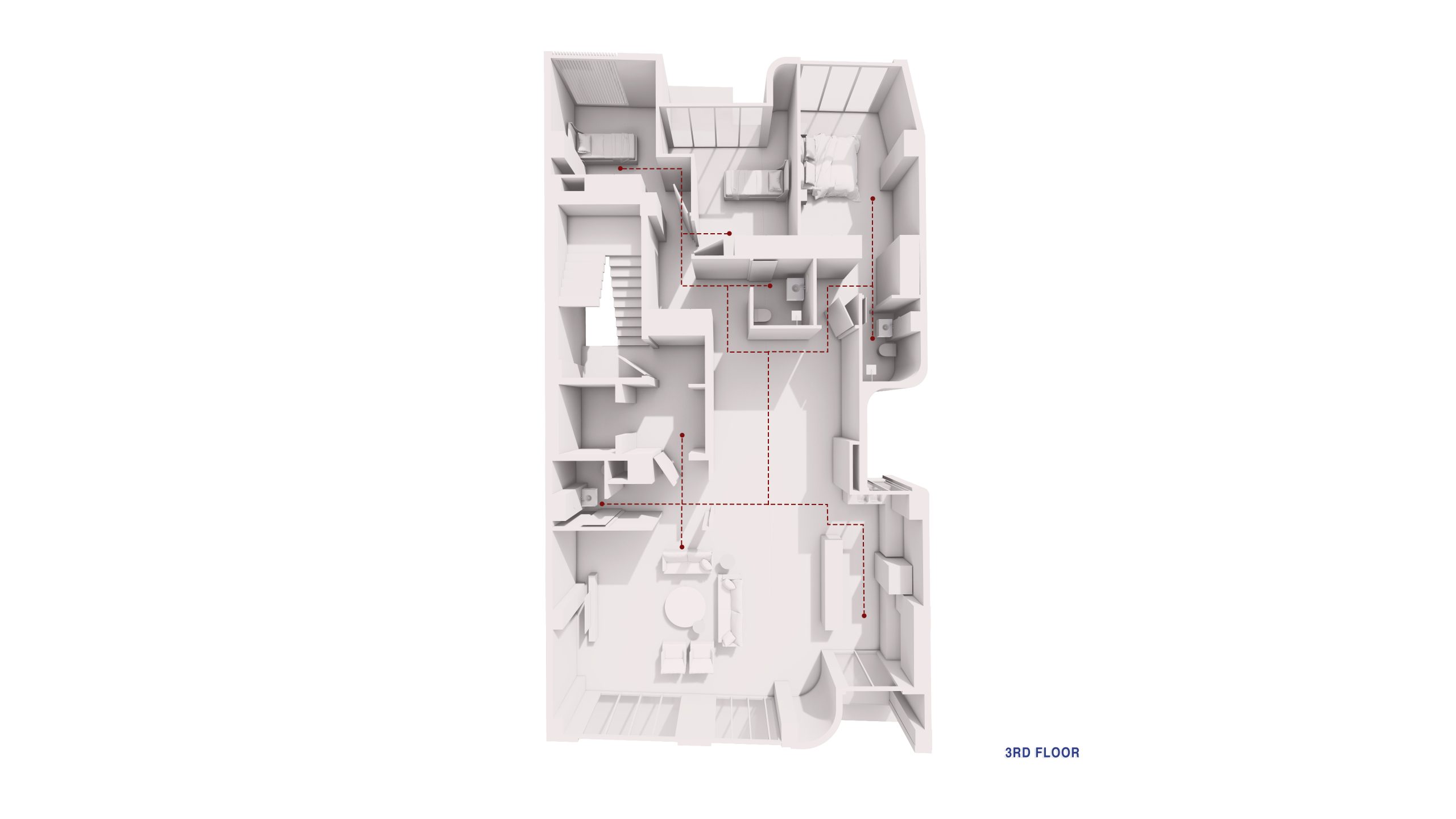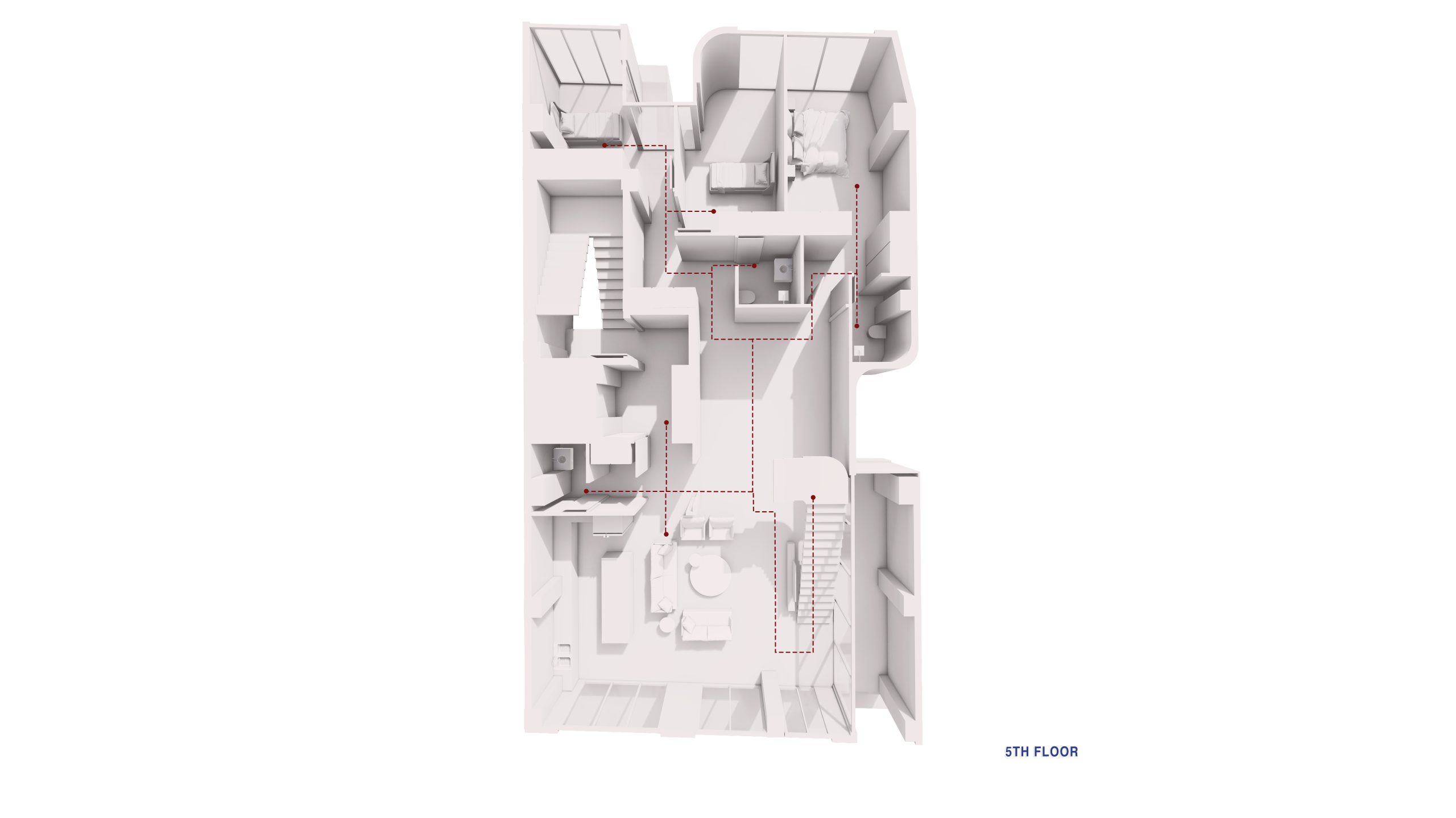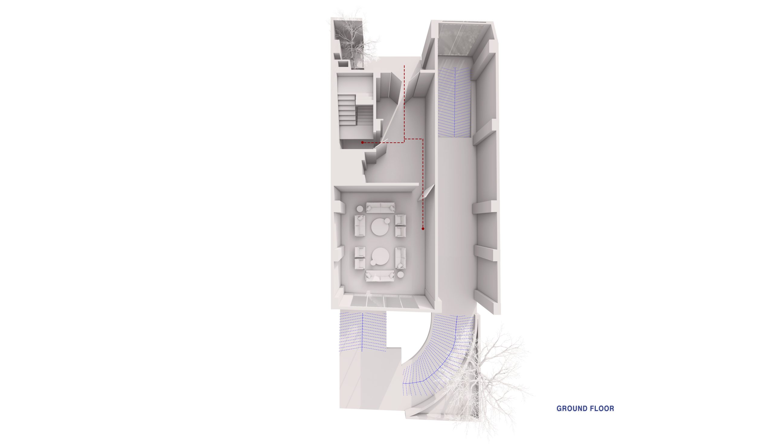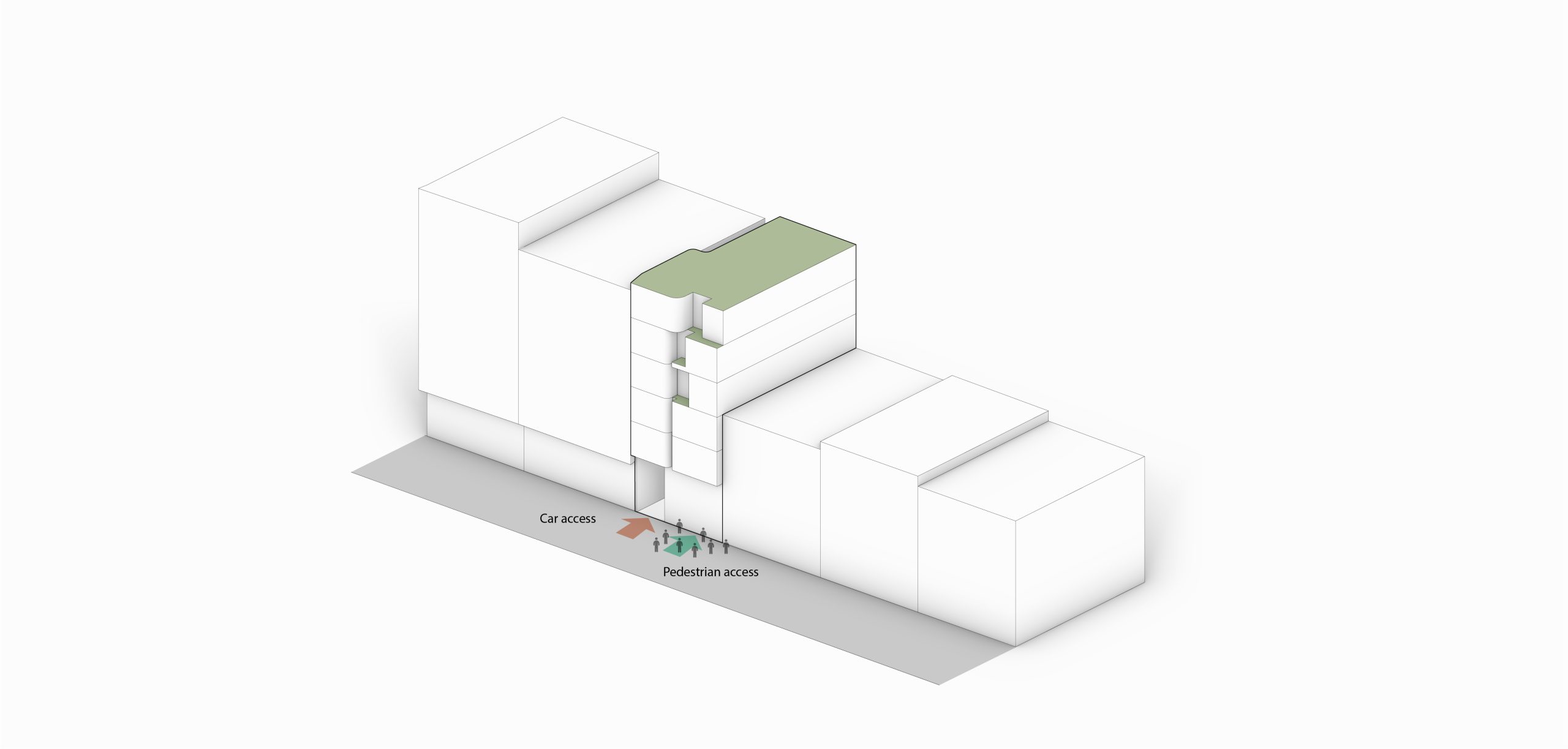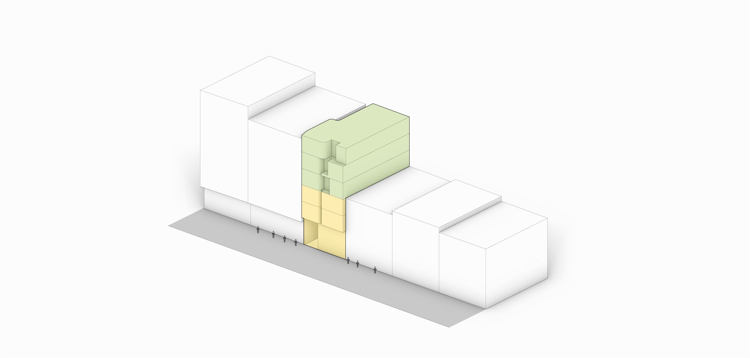 The interplay between mass and void, echoed in different rhythms throughout the floors, lends the facade a dynamic and attractive appearance. The inclusion of terraces adds depth to the facade’s structure, while curved edges and vegetation create a sense of softness and tranquility, contrasting with the facade’s angular elements, reinforcing the concept of residence.