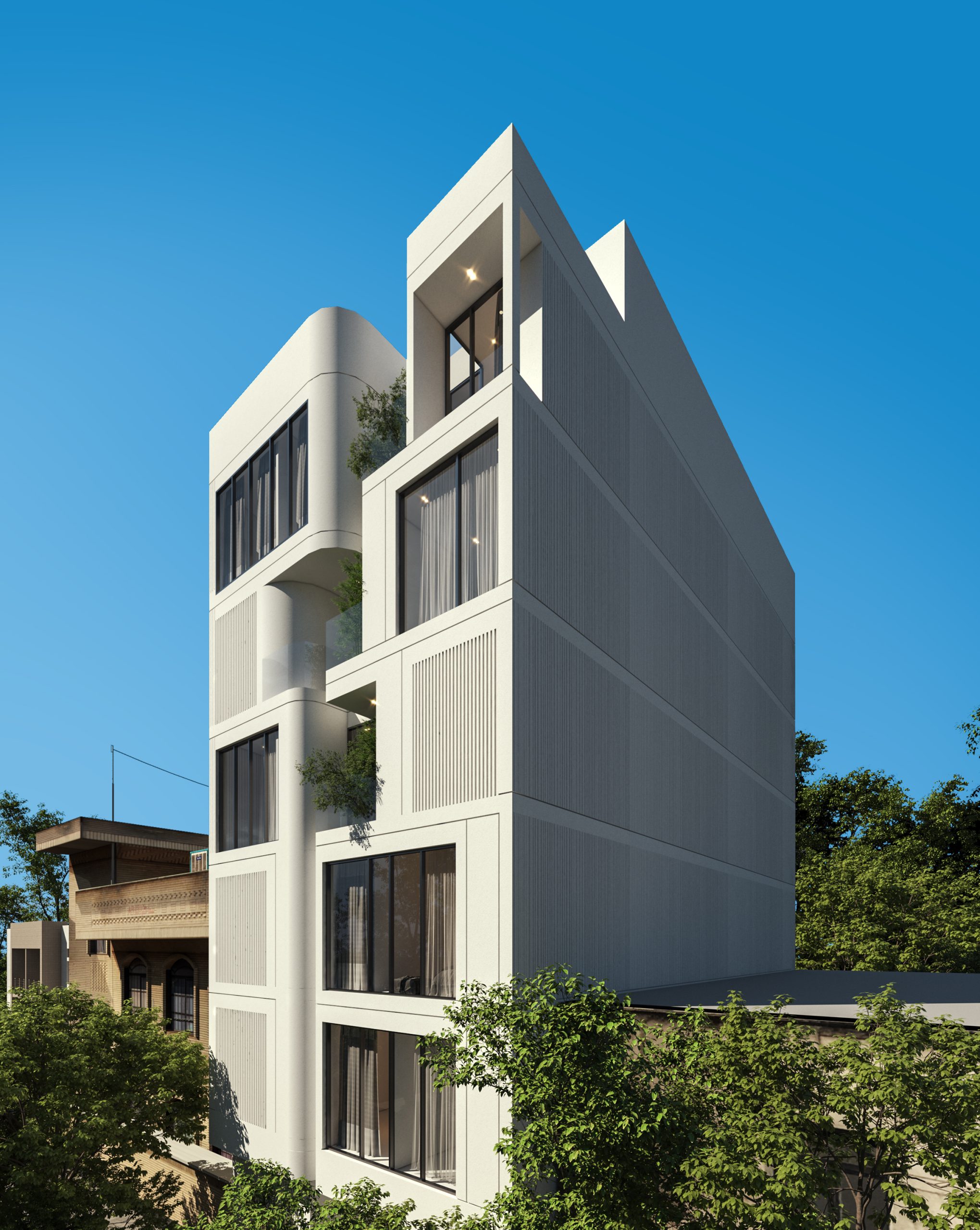 The overall layout and geometry of the volumes, while creating visual dynamism in the facade, have guided the residents’ gaze towards the surrounding landscapes and green spaces. In addition to enhancing privacy, this solution has improved natural lighting, proper ventilation, and increased the quality of the building’s interaction with the urban context.