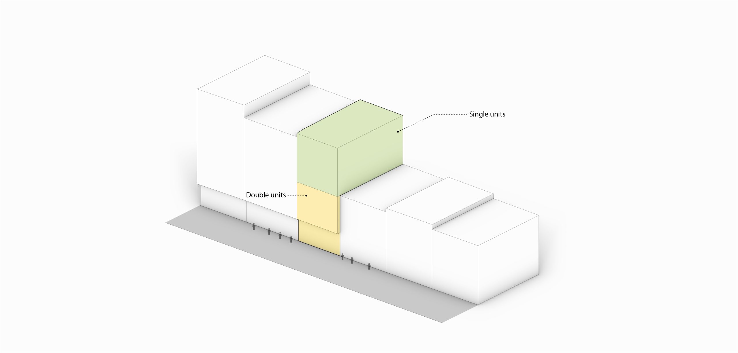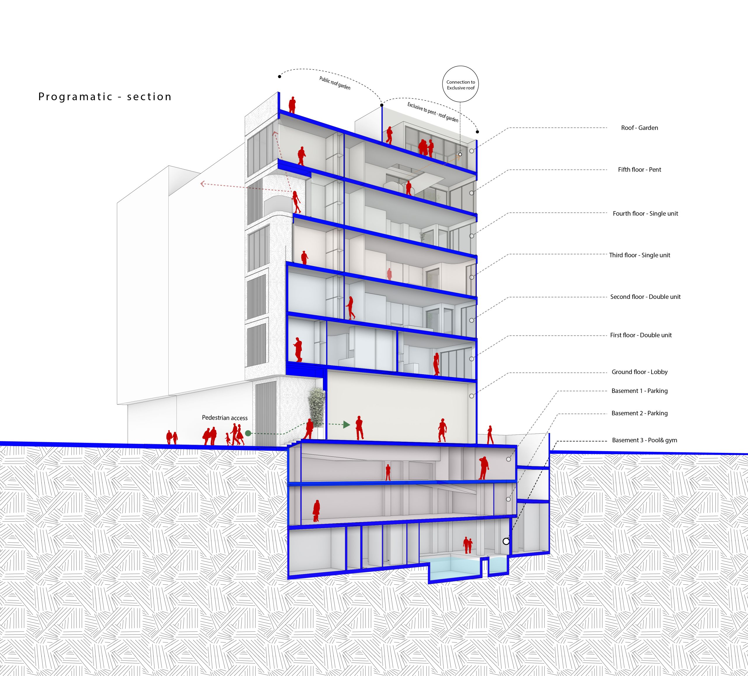 The Mehran project is a residential development comprising five floors, with a ground floor housing a lobby and meeting hall, and two basement levels designated for parking. The first residential floor accommodates two 2-bedroom units, while the upper floors consist of single units. Meeting municipal regulations, functional demands, and economic priorities has resulted in a structure not significantly different from conventional urban buildings.